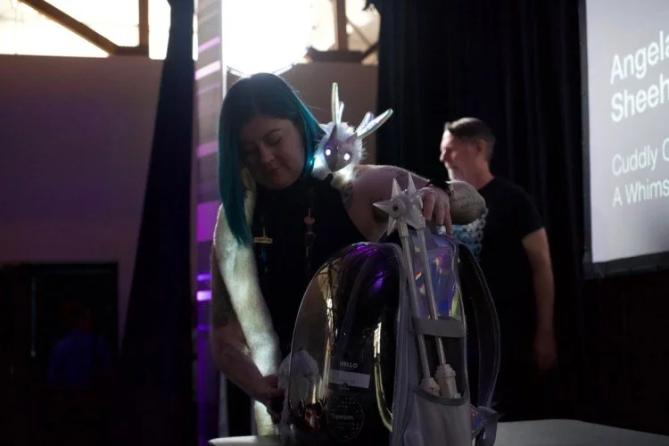 Angela Sheehan, an artist, maker and teacher, presented her talk on building “Cuddly Companion Bots.” Sheehan guided the audience through her process of designing and building “Nova,” a long-tailed creature that sat on her shoulder, inquisitively cocking its head and flapping its LED-lined wings.